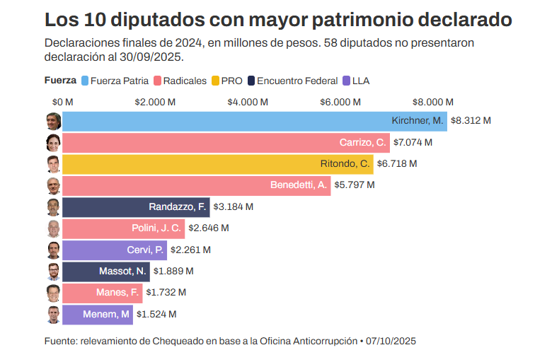 Un informe publicado por el sitio Chequeado repasa quiénes son los diputados nacionales con mayor patrimonio declarado al cierre de 2024. El dato surge de las declaraciones juradas que, por ley, deben presentar todos los legisladores ante la Oficina Anticorrupción.