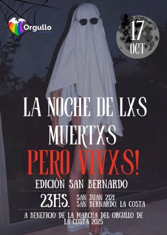 La noche del viernes será la antesala festiva, con la propuesta “La noche de lxs muertxs pero vivxs”, una fiesta de disfraces a beneficio de la Marcha del Orgullo 2025. La cita es a las 23 hs en San Juan 2121, San Bernardo. La entrada será con contribución voluntaria, y habrá música, ambientación, glitter y diversidad.