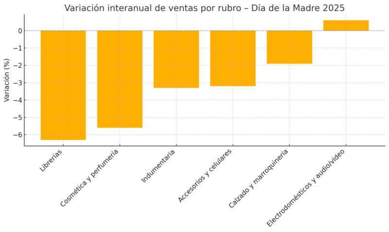 Electrodomésticos fue el único sector que logró una leve suba, con un +0,6% en las ventas. En cambio, rubros tradicionales como librerías, perfumerías y ropa registraron caídas de entre el 3 y el 6%.