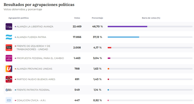 Destacada Elecciones Política La Libertad Avanza fue la fuerza más votada en La Costa 6 minutos atrás 0 Con un desempeño electoral que sorprendió a propios y ajenos a nivel país, la fuerza de Javier y Karina Milei se impuso en nuestro distrito. Cabe destacar que la jornada en La Costa se desarrolló con total normalidad. Mira los datos: Compartir Navegación de entradas Previous: La Libertad Avanza se impuso a nivel país Más historias Destacada Elecciones Nacionales Política La Libertad Avanza se impuso a nivel país 15 minutos atrás 0 Destacada Elecciones Política PBA | Con el 94,16 de los votos escrutados, se impone LLA 24 minutos atrás 0 Destacada Elecciones Nacionales Cerraron los comicios en el Partido de La Costa con una jornada tranquila 4 horas atrás 0 Deja una respuesta Cancelar la respuestaTu dirección de correo electrónico no será publicada. Los campos obligatorios están marcados con *Comentario * Nombre * Correo electrónico * Web