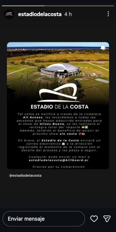 El Estadio de La Costa confirmó a través de sus redes sociales que realizará el reintegro total del valor de las entradas correspondientes al show de Ulises Bueno, que había sido suspendido. Además, se comunicó que quienes hayan adquirido tickets para ese evento tendrán la posibilidad de acceder sin costo al próximo espectáculo, en fecha a confirmar.